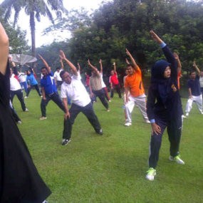 Memakai baju polo putih, celana hitam lengkap dengan sepatu kets kesayangannya, Dahlan melakukan peregangan bersamaan dengan karyawan lain.
