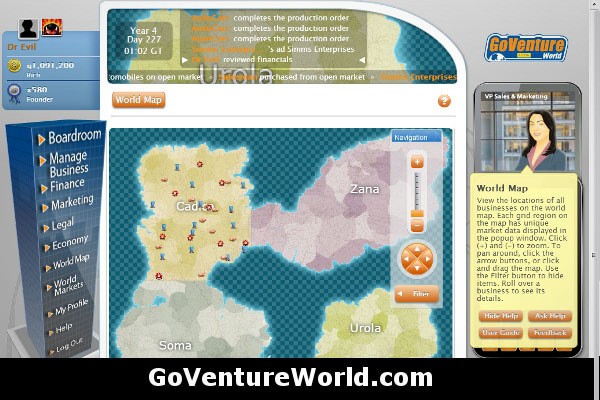 GoVentureWorld adalah virtual, tapi pengalaman kewirausahaannya nyata. Tujuan dari permainan ini adalahΒ membangun bisnis yang sukses, seperti yang didefinisikan oleh pendapatan, profitabilitas, pangsa pasar, nilai merek, harga saham dan banyak lagi. Untuk membangun bisnis yang sukses, seseorang harus bersaing dengan sumber daya dan pangsa pasar, disaat bekerja sama dengan perusahaan lain untuk memproduksi, memperoleh dan menjual produk atau jasa.