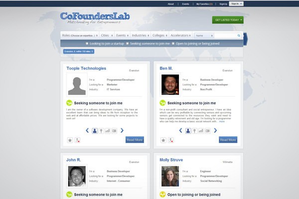 Di situs mereka, Anda dapat mencari pendiri perusahaan di kota tertentu, atau mengirim profil untuk diberikan kepada pengusaha. CoFoundersLab juga menyelenggarakan acara networking setiap bulan di seluruh Amerika Serikat secara gratis. Organisasi ini telah bekerja sama dengan merk startup teratas di pasar masing-masing.