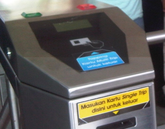 Lalu setelah itu tempel kartu ke mesin pintu otomatis (tapping in gate) sebelum masuk. Tunggu lampu hijau menyala dan dorong tripod gate, jika lampu hijau sudah menyala berarti sudah boleh masuk ke dalam peron stasiun.