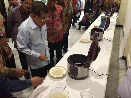 Setelah itu, JK mempraktikkan langsung demo masak. Beras mentah disiapkan di piring. Beberapa rice cooker dipakai untuk eksperimen ini.