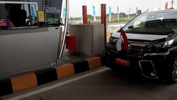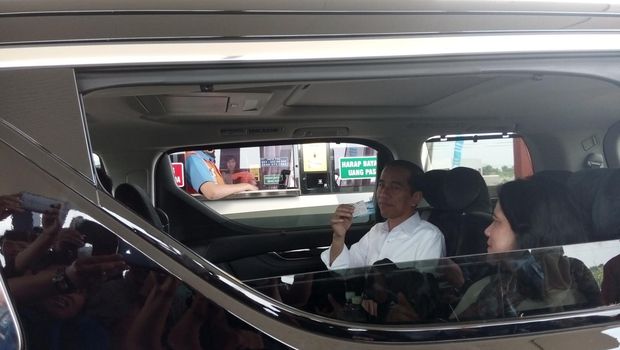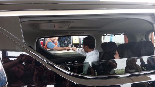 Jokowi yang duduk di kursi baris tengah bersama istri, mengeluarkan kartu BNI TapCash-uang elektronik untuk pembayaran tol Surabaya-Mojokerto.