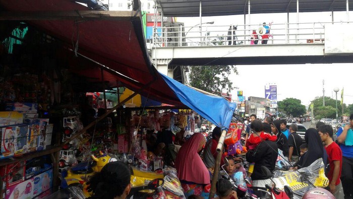 Alhasil ruas paling kiri dari jalan ini pun sedikit macet ketika dilalui oleh kendaraan. Penjualan mainan sudah meningkat sejak hari pertama Lebaran.