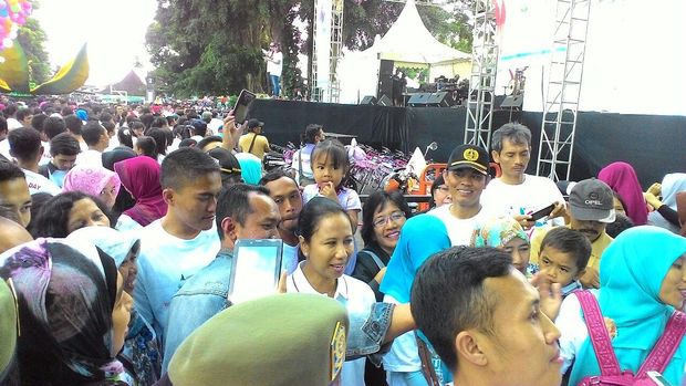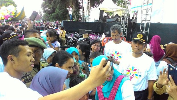 Setelah itu, giliran anak-anak muda yang mengajak Rini selfie. Ajakan selfie dari masyarakat tak sekali pun ditolak Rini. Semuanya dilayani, Rini selalu berhenti sejenak dan tersenyum saat diajak berfoto.