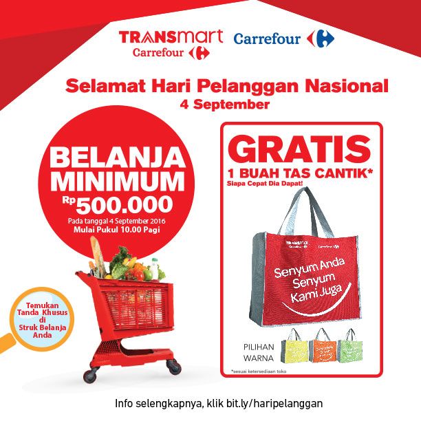 Jangan lupa, tanggal 4 September 2016 ini adalah Hari Pelanggan Nasional. Dapatkan tas belanja cantik dengan empat pilihan warna secara gratis di seluruh toko Transmart Carrefour dengan berbelanja minimal Rp 500.000 pada hari Minggu, 4 September 2016 mulai pukul 10.00 waktu setempat. Tukarkan struk belanja yang bertanda khusus dengan tas cantik pada area Customer Service. Untuk keterangan lebih lanjut mengenai Hari Pelanggan ini, klik http://carrefour.co.id/shop/haripelanggan/