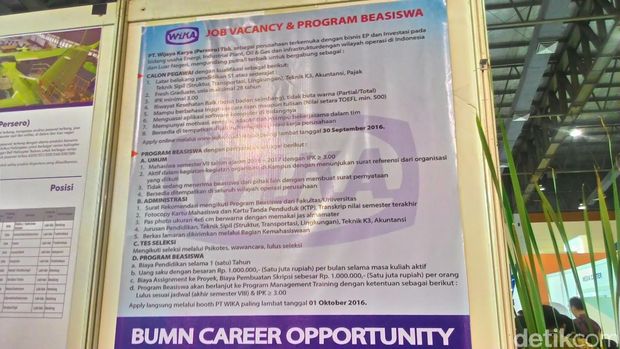 "PT Wijaya Karya (Persero) Tbk sebagai perusahaan terkemuka dengan bisnis EP dan investasi pada bidang usaha energi, industrial plant, oil & gas dan infrastruktur dengan wilayah operasi di Indonesia dan luar negeri, mengundang putra-putri terbaik untuk bergabung sebagai calon pegawai," sebut pengunguman yang terpampang di stand Indonesia Business and Development (IBD) Expo 2016, Jakarta Convention Centre (JCC), Jakarta Selatan, Jumat, (9/9/2016).