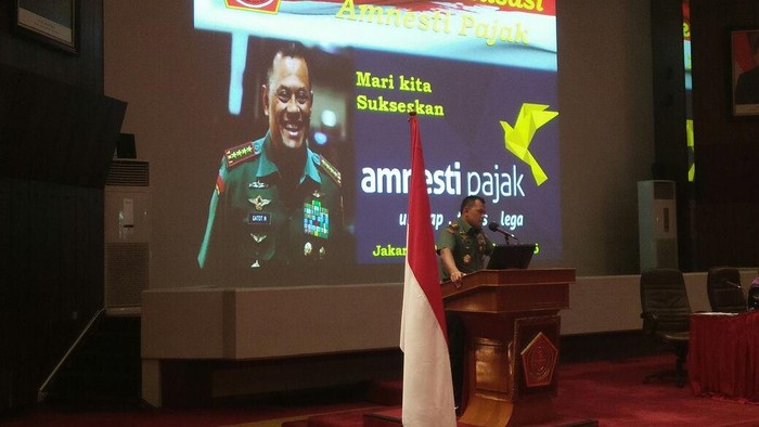 "Pagi ini saya ajak semuanya, bukan hanya buat para pati saja, tapi bisa jelaskan lagi pada prajuritnya, keluarga, dan ikut mensosialisasikan pada orang di sekitarnya," kata Gatot saat membuka sosialisasi tax amnesty di Mabes TNI, Rabu (21/9/2016).