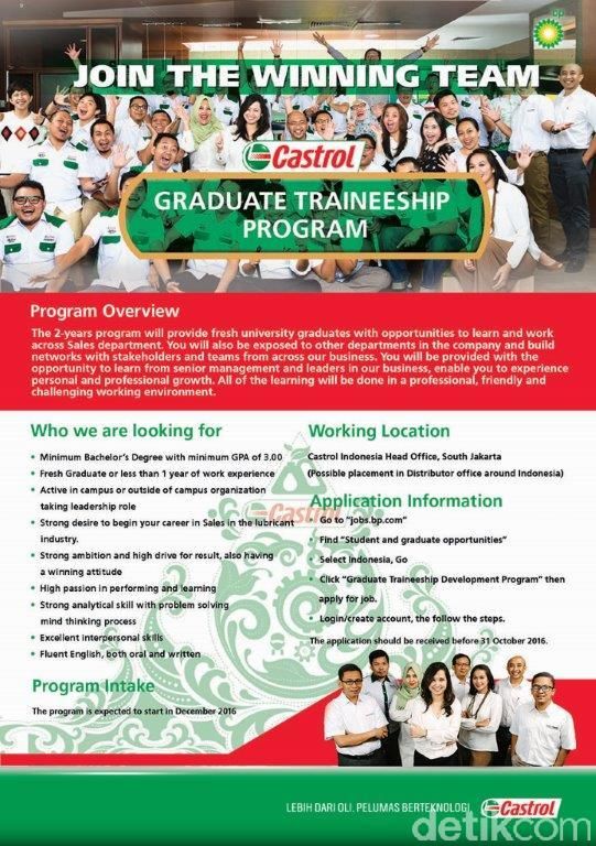 Untuk mendaftar bisa langsung melalui jobs.bp.com, cari student and graduate opportunity, pilih Indonesia. Klik Graduate traineeship Development Program dan klik apply. Lowongan ini paling lambat hingga 31 Oktober 2016.