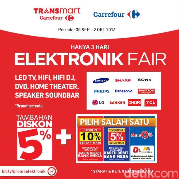 Masih banyak berbagai produk yang bisa didapatkan pada promo akhir pekan ini. Promo ini berlangsung selama Jumat, Sabtu, dan Minggu tanggal 30 September sampai 2 Oktober 2016 di Transmart Carrefour tertentu. Untuk keterangan lengkap mengenai tambahan diskon 5% untuk elektronik, klik http://bit.ly/ElektronikTC.