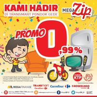 Khusus di Transmart Carrefour Pondok Gede yang hari ini baru saja dibuka, ada promo khusus untuk Megazip dengan program cicilan tanpa kartu kredit dengan bunga 0,99%. Penawaran khusus Megazip 0,99% ini berlaku untuk semua produk big & small appliances, furniture, dan sepeda dengan minimal pembiayaan Rp 3.000.000/unit. Dapatkan penawaran spesial ini khusus selama 3 hari, Jumat, Sabtu, dan Minggu (28-30/10/2016) di Transmart Carrefour Pondok Gede. (hns/hns)