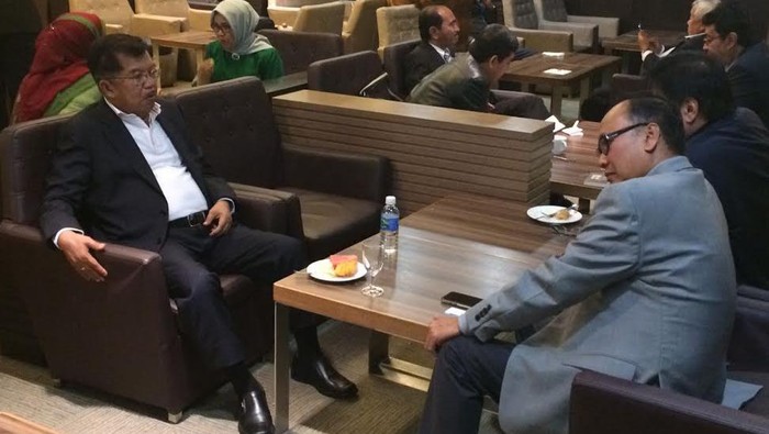 Awalnya diskusi dilakukan sambil berdiri. Namun tak lama, JK yang memakai kemeja putih dan celana hitam itu mulai duduk di lantai dan diikuti oleh Airlangga, Sofjan, dan lain-lain.