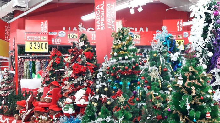 Tersedia berbagai pilihan pohon natal seperti Tree Pine White Glitter 180cm dengan harga Rp 1.459.000/unit, Tree Pine Gold Glitter 150cm dengan harga Rp 857.000/unit (harga pohon tidak termasuk aksesori Natal), dan Christmas Tree Green 120cm dengan harga Rp 189.000/unit.