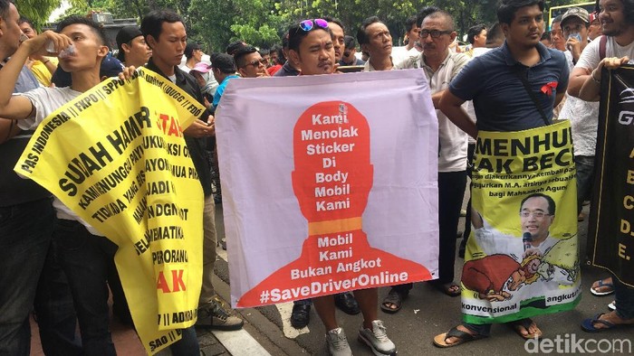 "Kami menolak stiker di body mobil kami, mobil kami bukan angkot. #save driver online," tulis pendemo dalam salah satu spanduk yang dibawanya ke depan kantor Kemenhub.