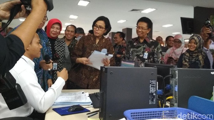 Setelah bertanya-tanya, Sri Mulyani yang didampingi oleh Dirjen Perbendaharaan Negara Marwanto Harjowiryono melanjutkan tinjauan ke loket lainnya.