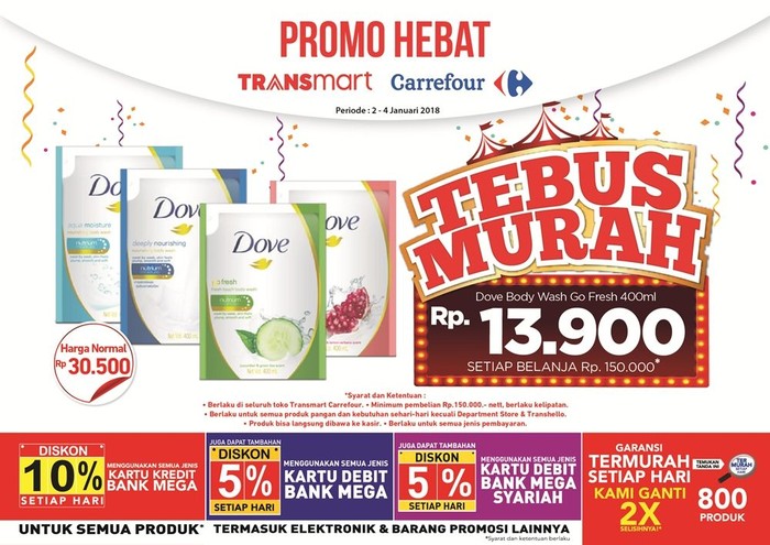 Penawaran istimewa bagi pelanggan ini berlangsung pada 2-4 Januari 2018. Tebus murah Dove Body Wash Go Fresh 400 ml hanya seharga Rp 13.900/pouch dari harga normal Rp 30.500/pouch.