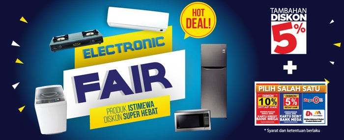 Ya, tambahan diskon 5%. Seperti mesin cuci (dari brand Bestlife,Zerowatt, Denpoo, Electrolux, Midea, Panasonic dan Samsung), kulkas (dari brand Electrolux, Panasonic dan Samsung), AC (dari brand Aux, Denpoo, Electrolux, Midea, Samsung), Microwave (hanya dari brand Electrolux) dan kompor (Denpoo, Electrolux, Getra, Maspion, Rinnai, dan Miyako).