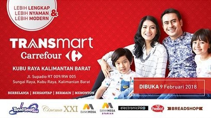 Dengan waktu tempuh 10 menit dari Bandara Supadio, gerai Transmart Carrefour ke-109 tersebut hadir sebagai destinasi belanja keluarga yang nyaman. Luasnya mencapai 11.483 m2 dan didukung oleh 240 associate, gerai ini menyediakan semua barang-barang berkualitas serta menghadirkan pula Department Store, Bread Shop, Kids City, Trans Hello, Electronic Pro, hingga Cinema XXI yang semakin melengkapi hiburan keluarga.