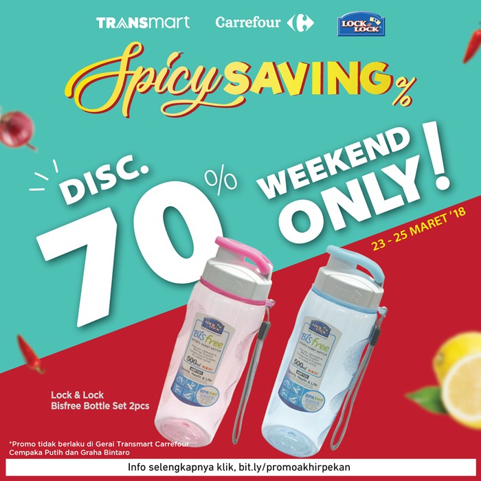 Promo ini tidak berlaku di gerai Transmart Carrefour Cempaka Putih dan Graha Bintaro. Spesial untuk anda yang ingin mencoba kreasi resep baru di akhir pekan ini, dapatkan juga diskon hingga 30% dari koleksi peralatan masak Maxim, Supor, Bolde, dan Fincook. Dengan varian peralatan masak yang lengkap, dijamin pengalaman kuliner anda akan semakin bertambah.