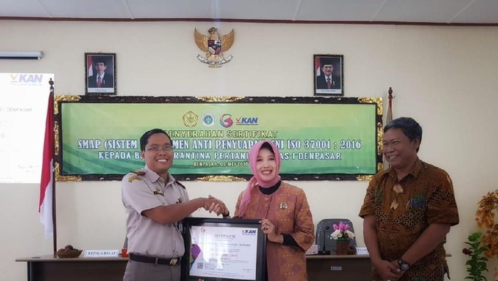 Sementara Kepala Balai Karantina Pertanian kelas I Denpasar, Putu Terunanegara menyampaikan sertifikasi ini akan mendorong BKP Denpasar untuk terus mengendalikan praktik penyuapan dengan cara mencegah, mendeteksi, melaporkan, dan menangani penyuapan.