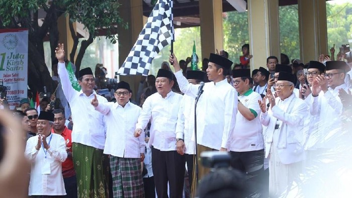 "Dengan mengucap Bismillahirrahmanirrahim Kirab Santri dan Jalan Sehat pagi ini saya nyatakan diberangkatkan," kata Jokowi.
