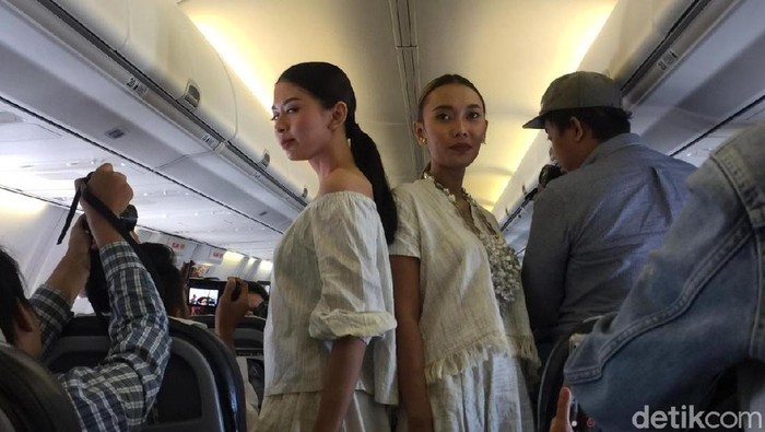 Untuk peragaan busana dilakukan di kabin pesawat dalam perjalanan udara menuju Surabaya.