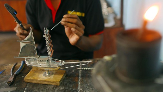 "Yang bikin mahal biasanya ya karena kita bikin master-masternya dulu, bikin cetakan, lalu krn 97% komposisinya timah murni. Selain ukuran, detail yang sulit, seperti kapal pinisi itu kan detailnya lengkap jadi menentukan harganya, yang paling mahal sih biasanya ukurannya 60 - 90 cm sampai semeter lebih tingginya," tuturnya.