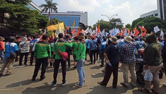 Buruh yang demo di depan gedung Kementerian Ketenagakerjaan (Kemnaker) mulai menyuarakan aspirasinya. Permintaan agar Presiden Joko Widodo (Jokowi) mencopot Menteri Ketenagakerjaan (Menaker) Ida Fauziyah pun menggema.