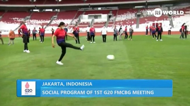 Sri Mulyani tampak ikut menendang bola bergantian dengan para delegasi lainnya. Suasana tampak cair dan saling berbincang meski tetap menggunakan masker.
