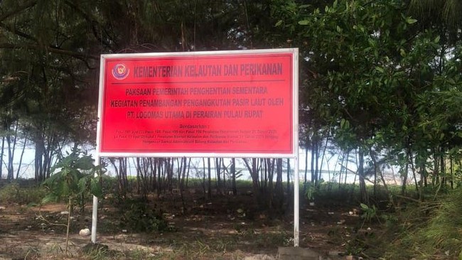 "Pemasangan papan larangan operasional di ketiga pulau yang diduga mengalami kerusakan akibat dampak dari penambangan pasir laut tersebut merupakan langkah lanjutan dalam penanganan kasus penambangan pasir laut yang merusak oleh PT. Logomas Utama tersebut," ujar Direktur Jenderal Pengawasan Sumber Daya Kelautan dan Perikanan, Laksamana Muda TNI Adin Nurawaluddin dalam keterangan tertulis, Rabu (23/2/2022).