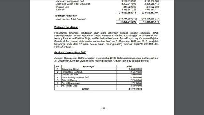 Laporan keuangan BPJS Ketenagakerjaan tahun 2019 tersebut menjadi heboh karena memuat laporan anggaran untuk membership golf senilai Rp 3 miliar.
