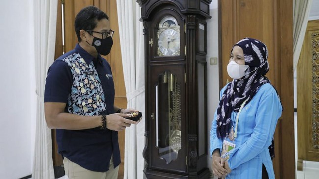 Menteri Pariwisata dan Ekonomi Kreatif (Menparekraf) Sandiaga Uno mendapatkan hadiah dari Izuryani (37), pelaku kriya aksesoris dan perhiasan di Pacitan. Ia terkejut mendapatkan sebuah kalung khusus untuk sang istri, Nur Asia Uno.