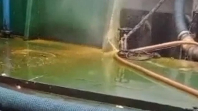 Pada video itu, terlihat minyak goreng disalurkan melalui pipa, dari satu kapal ke kapal lainnya. Namun, nampak ada kebocoran juga di pipa itu yang membuat minyak goreng keluar.