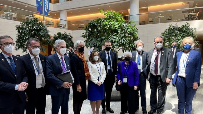 Dalam foto itu terlihat Presiden ECB Christine Lagarde, Menteri Keuangan AS Jannet Yellen, Menteri Keuangan Belanda Sigrid Kaag, Menteri Keuangan Jerman Christian Lindner dan beberapa perwakilan negara-negara barat lainnya.