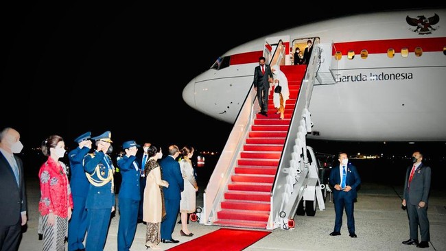 Dikutip dari laman Setkab, Rabu (11/5/2022), Jokowi dan rombongan tiba setelah menempuh kurang lebih 24 jam penerbangan dari Jakarta dengan transit di Amsterdam, Belanda. Jokowi menumpangi pesawat Garuda Indonesia dengan kode penerbangan GIA-1 mendarat di bandara milik militer AS.