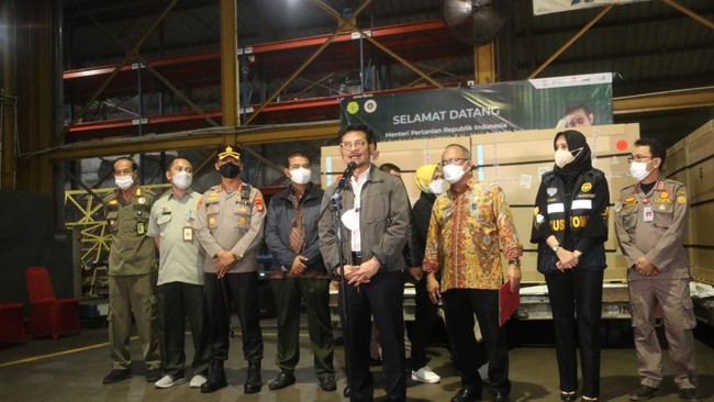 Menteri Pertanian Syahrul Yasin Limpo menerima secara langsung vaksin penyakit mulut dan kuku (PMK) sebanyak 800 ribu dosis di Bandara Internasional Soekarno-Hatta, Tangerang, Banten, Jumat dini hari, (17/6/2022).