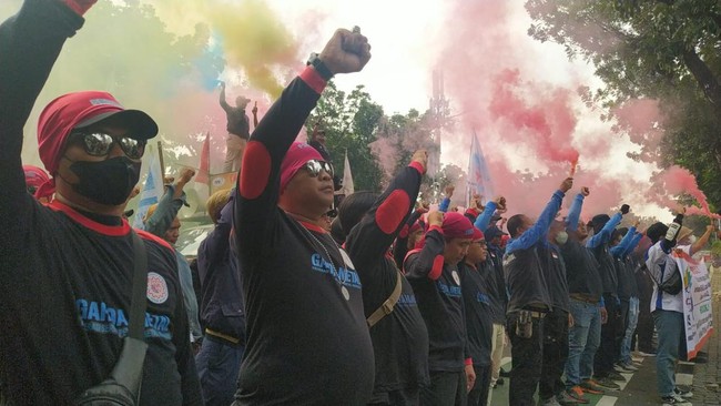 Buruh melakukan aksi di depan kantor Gubernur DKI Jakarta Anies Baswedan, Balai Kota DKI Jakarta. Dalam kesempatan itu, masa aksi mengecam gugatan dari Asosiasi Pengusaha Indonesia (APINDO) yang minta UMP 2022.