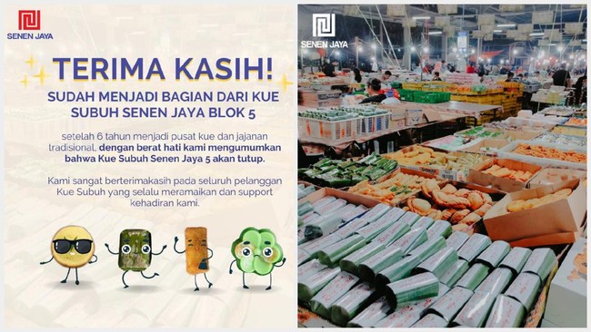 Hal ini diumumkan lewat akun Instagram resmi @senenjayaofficial. Dalam pengumuman tersebut disebutkan sentra kue subuh di Senen Jaya Blok 5 akan tutup setelah 6 tahun menjadi salah satu pusat belanja kue dan jajanan tradisional di Jakarta Pusat.