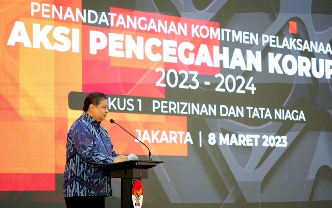 Hal tersebut disampaikan Airlangga dalam acara penandatanganan 'Komitmen Pelaksanaan Aksi Pencegahan Korupsi Tahun 2023-2024' di Gedung Merah Putih Komisi Pemberantasan Korupsi (KPK), Rabu (8/3/2023).