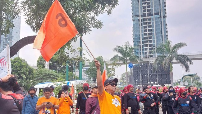 Terpantau dari lokasi, Selasa (21/3/2023), 4 bus berisi massa aksi telah tiba di tepi jalan Gatot Subroto pada pukul 10.30 WIB. Salah seorang massa aksin, bus tersebut berasal dari kawan buruh Bekasi.