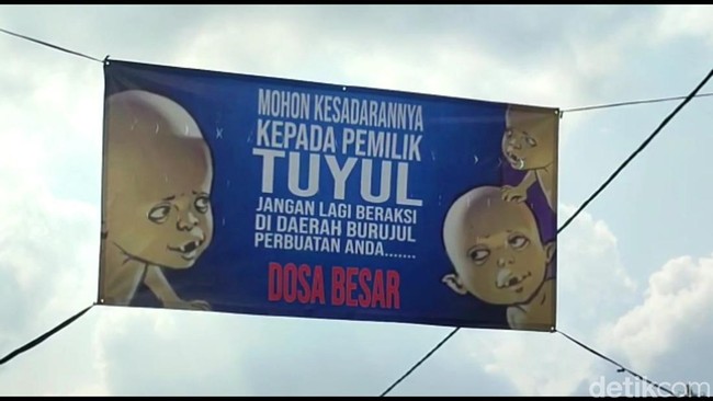 Spanduk ini sengaja dipasang karena sejumlah warga kesal sering kehilangan uang tanpa sebab. Mereka meyakini uang yang mereka simpan itu raib diambil oleh tuyul.