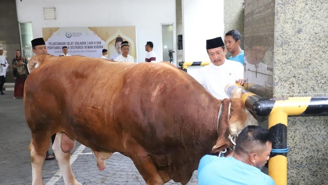 "Alhamdulillah totalnya di sini kita memotong empat sapi dan dua kambing, untuk dibagikan kepada masyarakat yang berhak," ungkap Trenggono saat meninjau hewan kurban di area parkir Gedung Mina Bahari III KKP, dalam keterangannya, Kamis (29/6/2023).