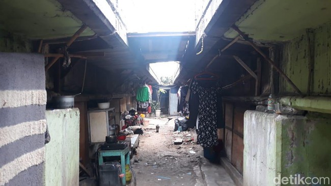 Sedangkan pada bagian kanan dan kiri celah jalan ini (tepat di bawah jalan tol) digunakan sebagai tempat tinggal warga.Terlihat juga ada banyak pakaian dijemur di depan rumah-rumah semi permanen itu.