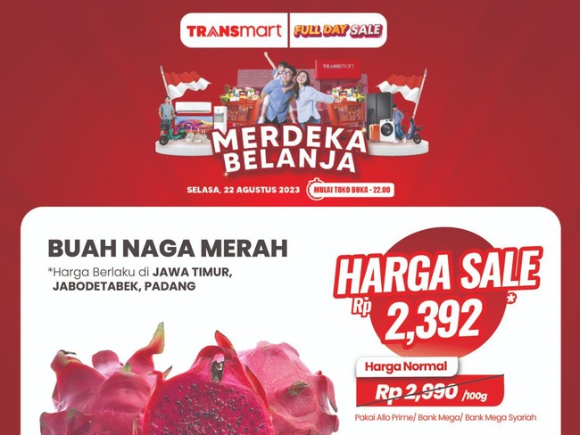 Salah satunya ialah produk Buah Naga Merah. Di Jabodetabek, Jawa Timur, dan Padang, buah ini diskon dari harga normal Rp 2.990 per 100 gr menjadi hanya Rp 2.393 per 100 gr. Lalu Di Makassar dan Palu, dari harga Rp 2.450 per 100 gr spesial di Transmart Full Day Sale jadi hanya Rp 1.960 per 100 gr.