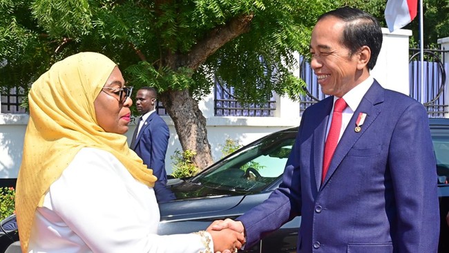 Presiden Joko Widodo (Jokowi) bertemu dengan Presiden Republik Tanzania Samia Suluhu Hassan di Dar Es Salaam State House, Tanzania. Dalam pertemuan itu, Jokowi mengatakan keduanya membahas mengenai kerja sama perdagangan kedua negara.