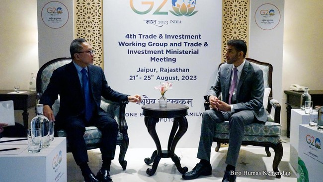 Pernyataan tersebut disampaikan Zulhas dalam pertemuan bilateral dengan Menteri Perdagangan Luar Negeri Persatuan Emirat Arab Thani Bin Ahmed Al Zeyoudi, di sela G20 Trade and Investment Ministerial Meeting (TIMM) di Jaipur, India. Zulhas dalam kesempatan tersebut didampingi oleh Direktur Jenderal Perundingan Perdagangan Internasional, Djatmiko Bris Witjaksono, serta Staf Khusus Mendag, Bara Krishna Hasibuan.