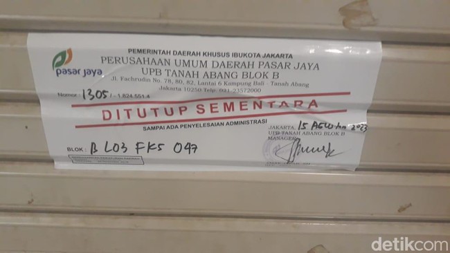 Selain itu di beberapa toko yang sudah tutup, terlihat ditempeli kertas yang berisikan peringatan kepada pemilik belum membayar biaya pengelolaan pasar (BPP). Sejumlah toko terlihat baru mendapat peringatan pertama dan yang lain ada yang sudah sampai peringatan ke-3.