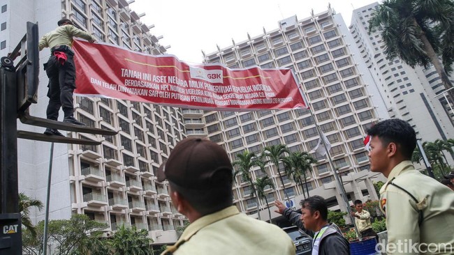 "Tanah Ini Aset Negara Milik Pemerintah Republik Indonesia Berdasarkan HPL Nomor 1/Gelora Atas Nama Sekretariat Negara C.Q PPKGBK dan Telah Dinyatakan Sah Oleh Putusan Peninjauan Kembali Mahkamah Agung Nomor 276 PK/PDT/2011," tulis spanduk tersebut yang telah terpasang di depan Hotel Sultan.