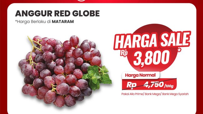 Beragam tawaran menarik ditawarkan Transmart melalui Full Day Sale, salah satunya produk buah-buahan. Khusus pelanggan di Jabodetabek yang transaksi menggunakan Allo Prime, Allo Paylater dan kartu kredit Bank Mega atau Bank Mega Syariah bisa mendapatkan anggur red globe seharga Rp 4.256 per 100 gram. Adapun harga normalnya ialah Rp 5.320 per 100 gram.