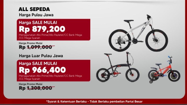 Sementara untuk pelanggan di luar Pulau Jawa, harga promo untuk semua jenis sepeda adalah Rp 1.208.000.