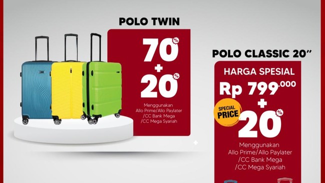 Pertama adalah Koper Polo Classic 20". Transmart menghadirkan harga spesial Rp 799.000 + 20% diskon tambahan jika pelanggan setia menggunakan kartu kredit Bank Mega atau Bank Mega Syariah, Allo Prime, dan Allo Bank.